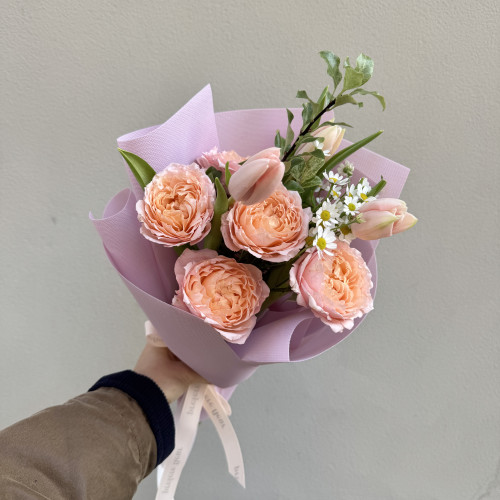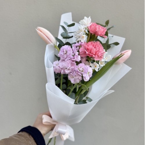 We create each arrangement using only fresh spring flowers, carefully selecting harmonious colors and elegant festive wrapping. Every bouquet is handmade on the day of the order to ensure maximum freshness and a beautiful appearance.