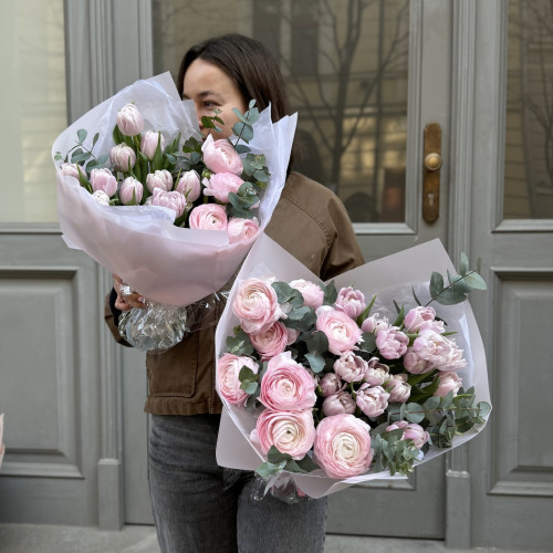 A delicate bouquet of ranunculi made from a mix of flowers with similar shades will delight everyone. The flowers are odorless, so they are perfect for allergy sufferers. With proper care, bouquet will last in a vase for a month.