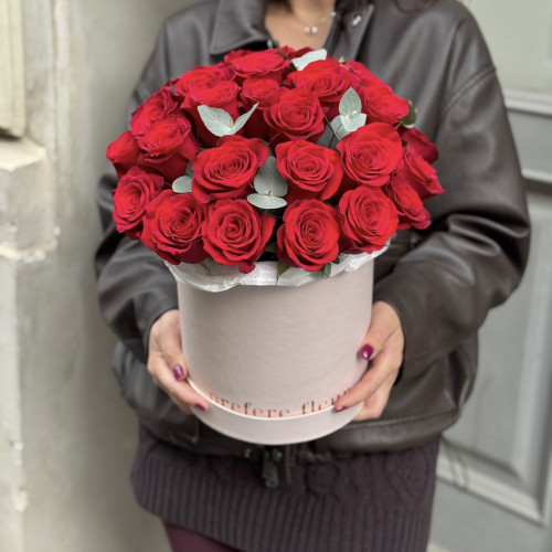 Darujte klasické rudé růže v elegantní kloboukové krabici, které zahřejí u srdce při každé radostné události.